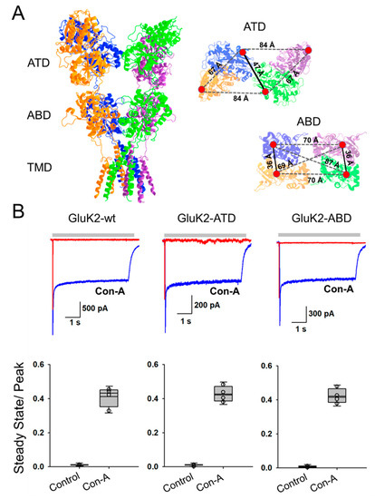 Exogenous jack-bean extract, Concanavalin A (Con-A), is a lectin which is known to bind to carbohydrates attached to proteins through N-glycosylation [16,17,18]. Con-A has been found to modulate the function of kainate receptors by changing the extent of desensitization [16,19]. Using site-directed mutagenesis, it has been shown that the glycosylation sites on kainate receptors play a role in Con-A modulation [17,18]. These glycosylation sites are spread throughout the extracellular ATD and ABD domains, and it has not been possible to draw direct correlations between binding site, conformation, and functional modulation [17,18,20,21]. Functional studies have shown that Con-A binding and modulation is state-dependent. Specifically, preincubation with Con-A prior to glutamate application produces larger effects on loss of desensitization than upon co-application with glutamate simultaneously. Furthermore, the preincubation effects are less pronounced with partial agonists [22,23]. The differential effects due to pre-incubation provide indirect evidence for the state-dependent effect of Con-A. However, apart from these indirect measurements, the specific conformational mechanism underlying Con-A modulation is still unknown.