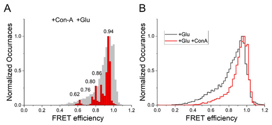 Conformational landscape of the distance between subunits at the dimer interface of the agonist-binding domain (ABD) of a homomeric GluK2 receptor (measured at site 479). (A) Denoised FRET efficiency histogram, in red, overlapped over observed FRET efficiency histogram, in gray, depicting FRET efficiency occurrences in the presence of Con-A and glutamate. (B) Comparison between observed FRET efficiency histograms of glutamate-bound homomeric GluK2 receptors in the absence (in black) [34] and presence (in red) of Con-A, illustrating a decrease in the low-FRET efficiency population in the presence of Con-A.