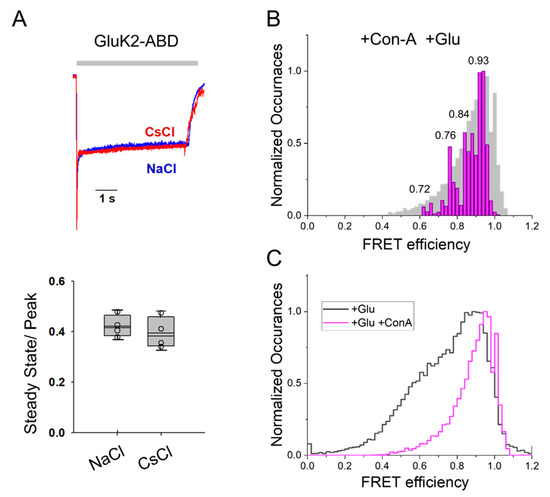To further investigate the changes at the dimer interface of the ABD caused by Con-A binding, we studied the effect of Con-A on the Na+ modulation of kainate receptor function. For investigating Na+ ion modulation, we compared the whole-cell currents from GluK2-ABD homomeric receptors mediated by 10 mM glutamate in the presence of Con-A with Na+ ions in the extracellular buffer to those measured in the extracellular buffer when Na+ was replaced with Cs+ (Figure 4A). No significant differences were observed in the currents when Na+ was replaced with Cs+ in the presence of Con-A. These results in the presence of Con-A are in contrast with prior investigations showing a large decrease in currents when Na+ was replaced with Cs+ in the absence of Con-A [37]. Additionally, the extent of the residual current (non-desensitizing) due to stabilization with Con-A was similar in Cs+ (Figure 4A) and in Na+ (Figure 1). These investigations showed that in the presence of Con-A, the Na+ ion modulation of GluK2 receptor function was not observed and was consistent with the smFRET observations that showed that Con-A stabilized the ABD dimer interface and thus, removed the need for stabilization by Na+ ions. To further confirm that the stabilization of the dimer interface in the presence of Con-A was maintained in the presence of Cs+ ions, we investigated the distances at the dimer interface using smFRET. The smFRET histogram obtained with GluK2-ABD receptors when Na+ ions were replaced with Cs+ ions (Figure 4B) was similar to that obtained with Na+ ions (Figure 3). The shift to higher efficiency FRET conformations in the presence of Con-A relative to those previously reported in its absence in measurements performed when Na+ ions were replaced with Cs+ ions is shown by overlapping the FRET efficiency histograms (Figure 4C). Overall, the smFRET data show that Con-A favors a more coupled dimer interface even when Na+ ions are replaced with Cs+ ions, and this, in turn, can be related to the similar whole cell currents observed in both Na+ ions and Cs+ ions.