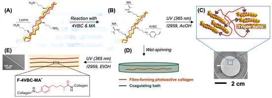 Design of hierarchically assembled type I collagen fibres. Reaction of CRT (A) with 4VBC and MA enables covalent coupling of multiple photoactive residues (B). UV-curing generates a covalent hydrogel network following solubilisation of the photoactive CRT precursor in the presence of the I2959 photoinitiator (C). The photoactive CRT precursor is wet spun against ethanol (D) and UV-cured to realise individual fibres with enhanced material integrity and controlled nanoscale organisation (E).