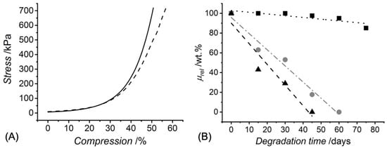 (A): stress-compression curves of hydrogels 4VBC-MA* prepared with either 0.4 (– –) or 0.8 wt.-% (—) concentration of sequentially-functionalised CRT. (B): relative mass profiles displayed by UV-cured hydrogels 4VBC-MA* (■, ∙∙∙: y = 102.85 − 0.18x, R2 = 0.71), 4VBC* (●, —·—: y = 95.8 − 1.64x, R2 = 0.98), and GMA* (▲, – –: y = 90.1 − 2.09x, R2 = 0.93) during hydrolytic degradation in vitro (37 °C, pH 7.4).