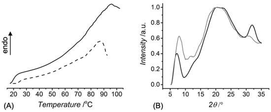 DSC and WAXS analyses were subsequently carried out to investigate the thermal properties and structural organisation of CRT in the crosslinked state (Figure 3). The thermal properties of type I collagen are described by the denaturation temperature (Td) of triple helices, above which unfolding into randomly coiled polypeptides occurs. The Td of CRT has been recorded in the range of 60–70 °C, whereby covalent crosslinking highly affects the thermal stability of collagen [20,21,27]. DSC thermograms of the UV-cured CRT hydrogels indicated an endothermic transition at 86–96 °C, which is attributed to the denaturation of collagen triple helices into random coils [20,22,35]. Variations of sample 4VBC-MA concentration (c = 0.4 → 0.8 wt.%) in respective hydrogel-forming solutions were found to directly impact on the Td (86 → 96 °C) of each resulting hydrogel (Figure 3A), in line with the concentration-induced effect on the crosslink density and thermal stabilisation of triple helices [20,22,23].