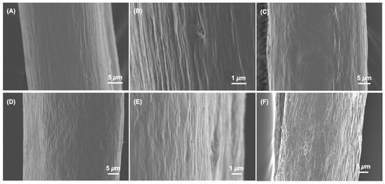 SEM of individual wet spun (A,B,D,E) and UV-cured (C,F) fibres prepared from either 4VBC-functionalised CRT (A–C) or GMA-functionalised CRT (D–F). (A,B): F-4VBC; (C): F-4VBC*. (D,E): F-GMA; (F): F-GMA*.
