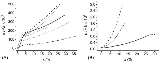 Tensile stress-strain curve of dry (A) and hydrated (B) wet spun functionalised CRT fibres. (—): F-GMA, (—): F-GMA*, (—∙∙—): F-4VBC, (—∙∙—): F-4VBC*, (— —): F-4VBC-MA, (— —): F-4VBC-MA*.