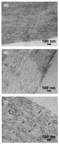 Fibres prepared by sequential wet spinning and UV-curing displayed a random configuration of collagen molecules where no alignment could be detected via TEM (Figure 6A). This observation reflects the absence of a conditioning step in a physiological environment [24,25,26,42] and the increased viscosity of the wet spinning solution of functionalised compared to native CRT [21]. Given its relatively low degree of functionalisation (F = 45 mol.%, Table 1), sample F-4VBC was therefore selected and incubated in PBS for up to 72 h (10 mM, pH 7.4, 37 °C) prior to UV curing. An increased degree of alignment was apparent on retrieved samples conditioned for either 24 or 72 h (Figure 6B,C), whereby the incubation time seemed to have a direct effect on fibrillogenesis. While fibres incubated for 72 h displayed some degree of collagen D-banding (black arrows), this effect was not detected on samples incubated for 24 h, whereby an increased degree of alignment was apparent compared to the fibre control.