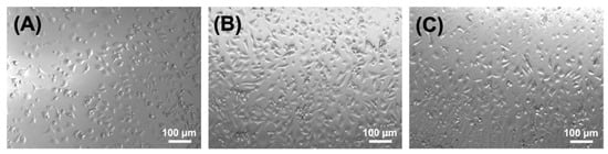 Optical microscopy images of L929 murine fibroblasts following 48-h culture on extracts of wet spun samples F-4VBC* (A), F-4VBC-MA* (B) and F-GMA* (C).