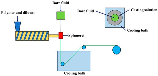 The PMP HF membranes were prepared via the TIPS method with a PMP concentration of 30 wt% by using a twin-screw extruder (KZW15TW, Technovel Corporation, Osaka, Japan), as shown in Figure 1. The casting solution formed from the PMP and MA was extruded from the spinneret, quenched into a cooling bath, and wound by a take-up roller. Bore fluid was introduced to the inner orifice to make the lumen of HFs. The cooling medium and bore fluids were water and glycerol, respectively. The temperatures of the spinneret, cooling bath, and bore fluid was set to be 240, 40, and 180 °C, respectively. The dope flow rate was 16.70 g/min−1. The air gap between the spinneret and the cooling bath was 40 mm. The fibers were extracted with anhydrous ethanol and the dry PMP HF membranes were obtained after the volatilization of ethanol.