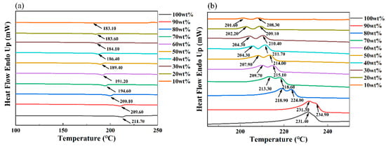 The DSC curves of the PMP-MA system with different PMP concentrations: (a,b) represent the crystallization curves obtained during the cooling period and the melting curves obtained during the heating period, respectively.