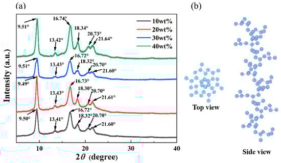 (a) the X-ray diffractograms of the PMP-MA system prepared with different PMP concentrations; (b) a schematic diagram of the top and side views of the carbon chain conformation in the crystalline phase of PMP [50].