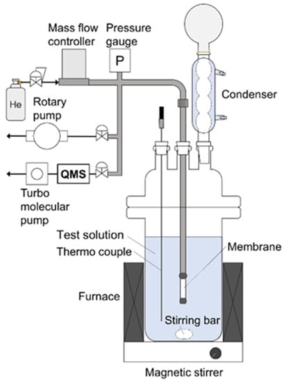 One end of the membrane was connected to a stainless-steel tube using a resin (GL Science, Torr seal, Tokyo, Japan), and the other end was capped. The effective membrane areas were 1.0 cm2 for the CHA, LTA, and MFI membranes and 2.0 cm2 for the FAU membrane, respectively. All membrane performances were evaluated by a pervaporation method using the apparatus shown in Figure 1. Ethanol, 1-propanol, 1-butanol, 1-hexanol, methyl acetate, methyl propionate, methyl butyrate, and methyl hexanoate were used as solvents in the test solution containing 10 wt% methanol for the pervaporation experiment. These alcohols and methyl esters are used as reaction substrates of transesterification reaction in our previous report [9]. The test solution (150 g) was added to a separable flask and heated at 303–353 K with stirring at 600 rpm. The membrane was immersed in the solution, and the inside of the membrane was evacuated using a rotary pump below 1 kPa. In addition, helium was introduced into the membrane at 1.0, 3.0, or 6.0 mL min−1 as the standard. The gas composition in the evacuated stream was analyzed using mass spectrometry (Pfeiffer vacuum, QGA, Asslar, Germany). The permeation flux, Ji, of component i was calculated as follows [13]: