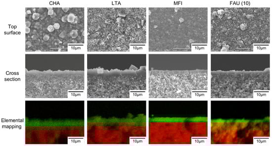 SEM images and cross-section elemental mapping of CHA, LTA, MFI, and FAU(10) membranes (Green: Si, Red: Al).