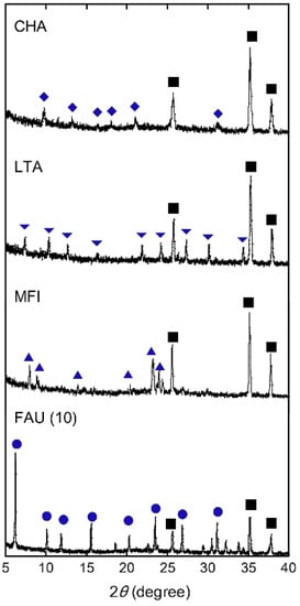 XRD patterns of CHA, LTA, MFI, and FAU(10) membranes. Symbols denote the diffraction peaks of CHA (diamond), LTA (inverted triangle), MFI (triangle), FAU (circle), and α-alumina (square).
