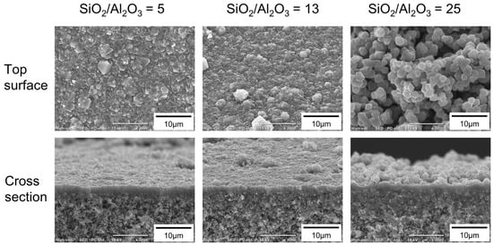 Figure 4 shows the effect of the molar composition of the synthesis solution on the morphology of the FAU membranes. When the molar composition of the synthesis solution was 25 SiO2:1 Al2O3:17 Na2O:1000 H2O (SiO2/Al2O3 = 25), many particles were deposited on the outer surface. However, few particles were observed at SiO2/Al2O3 ratios of 5, 10, and 13. The thicknesses of the polycrystalline layers were almost the same as 1.7–2.5 μm for all SiO2/Al2O3.