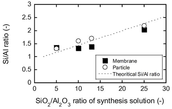 The calculation result is represented by the dashed line in Figure 5. The good agreement between the experimental data and theoretical values indicates that the membrane composition can be controlled by the composition of the synthesis solution.