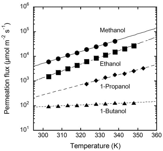 Figure 6 shows the temperature dependence of the permeation fluxes of single-component alcohols through the FAU(10) membrane. The methanol permeation flux was 5900 µmol m−2 s−1 at 303 K. The permeation flux decreased as the carbon number increased, and that of 1-butanol was 94.4 µmol m−2 s−1 at 303 K. The permeation flux of methanol increased with increasing solution temperature, reaching 41,400 µmol m−2 s−1 at 338 K. Ethanol and 1-propanol showed temperature dependencies similar to that of methanol. In contrast, the effect of temperature on the permeation flux of 1-butanol was smaller than that of the other alcohols.