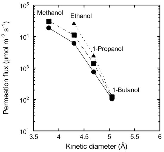 Figure 7 shows the influence of the molecular diameter on the permeation flux of single-component alcohols through the FAU(10) membrane at 323, 333, and 348 K. The permeation flux of methanol was 31,100 µmol m−2 s−1 at 333 K. The flux decreased with increasing molecular diameter, and that of 1-butanol was 122 µmol m−2 s−1. This significant effect of molecular size on the permeation flux is attributed to the molecular sieving function of the zeolite, even though the pore size of the FAU-type zeolite (0.74 nm) is larger than the molecular diameters of the alcohols (ethanol: 0.430 nm, 1-propanol: 0.469 nm, and 1-butanol: 0.504 nm). These results also support our claim that there are no large pinholes in the FAU membranes, as discussed in Table 3.