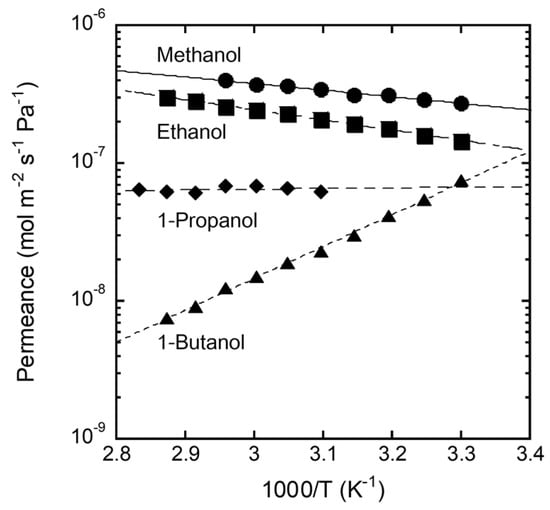 Because the permeation flux is described as the product of the permeance and the partial pressure difference, the permeation flux in Figure 6 includes the temperature dependence of the vapor pressure. To discuss only the membrane permeation phenomenon, the permeation flux was converted to permeance. The temperature dependence of the vapor pressure was calculated using the Antoine constant (Table 1).
