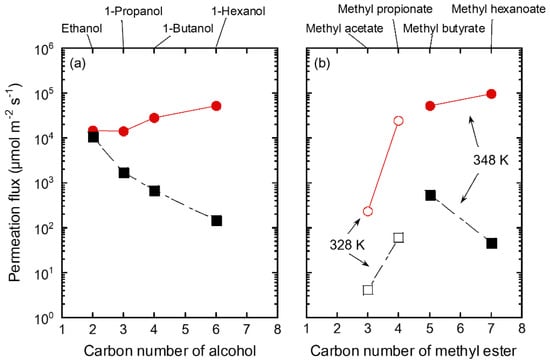 Influence of carbon number of (a) alcohol and (b) methyl ester on permeation fluxes of the FAU(10) membranes for 10 wt% methanol/solvent mixtures at 328 K (unfilled) and 348 K (filled). Symbols denote methanol (circle) and solvents (square).