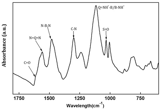 Figure 1 indicates the characteristic peaks present in the PANI/EG composite membrane. The characteristic bands observed at 1559 cm−1 and 1481 cm−1 correspond to the absorption peaks of the quinoid (N=Q=N) and benzenoid (N–B–N) rings, respectively. Generally, the characteristic bands of quinoid and benzenoid rings appeared at approximately 1598 cm−1 and 1498 cm−1 in undoped PANI membrane [15] (Figure S6 in the supplementary material). The quinoid stretching mode red shifted from 1598 cm−1 to 1559 cm−1, implying the interaction between π-conjugated structure and imine nitrogens of PANI, transforming the imine groups (=N–) into amine groups (–N–) [32]. The band at 1295 cm−1 corresponds to C–N stretching vibrations of secondary amine of PANI backbone. The peak at 1033 cm−1 was assigned to S=O stretching of sulfonic acid group, and the band at 1653 cm−1 corresponded to C=O stretching of PAMPSA, which was indicative of the incorporation of acids into membranes [33,34,35,36]. The band at 1120 cm−1 can be assigned to the plane bending vibration of a charged structure (Q=NH+–B or B–NH+) formed during protonation, associated with the degree of charge delocalisation on the polymer backbone [37].