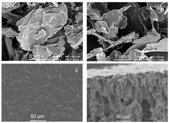 Microstructure of graphite (a) and exfoliated graphite (b), morphologies of surface (c) and cross-section (d) of the PANI/EG composite membrane.