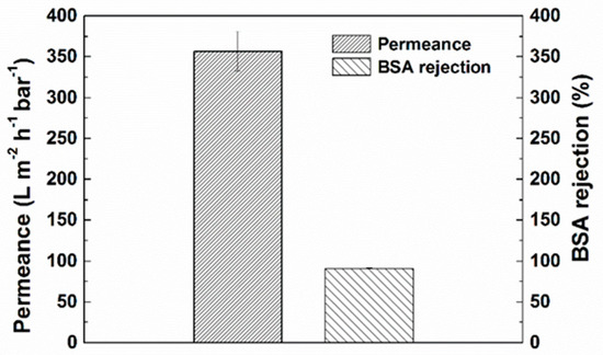 Water permeance of PANI/EG composite membranes was conducted in dead-end filtration and BSA nanoparticles were utilised to evaluate the membrane rejection. Figure 3 illustrates the permeance and BSA rejection of the membrane. The membrane permeance was 357 ± 24 L·m−2·h−1·bar−1 and the membrane exhibit above 90% rejection of BSA (MW = 66,000 g mol−1), which suggested that the MWCO of membranes was less than 66,000 g mol−1 with BSA as the MWCO probe.