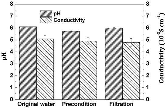 In order to test the membrane stability during filtration, the membrane conductivity and pHs of the membrane permeate during different filtration stages were measured. Figure 4 presents the membrane conductivity and pHs of the permeate (before filtration, after preconditioning and after the actual filtration) in the dead-end filtration using water as feed. In the different filtration stages, the membrane conductivity and pHs of the membrane permeate are kept stable, which indicated that the PANI/EG composite membranes were stable in filtration.
