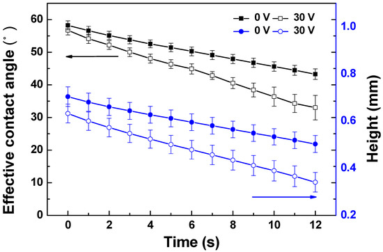 The effective contact angle and droplet height change of PANI/EG composite membranes over time with and without applied potential (30 V).