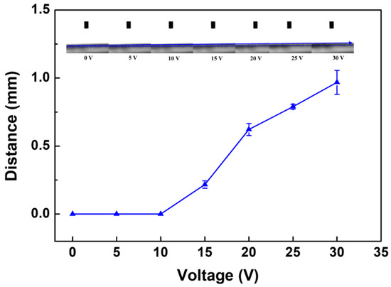 Figure 6 shows the membrane deformation degree under different applied potential. It was found that the deformation of PANI/EG composite membranes appeared at a fast response under applied potential and recovered to its original position almost immediately when removing applied potential. The main reason for the deformation is likely due to the applied voltage providing extra charge to the already positively charged membrane surface, which promotes the movement of counterions in the membrane structure. The movement of the counterions increases the steric hindrance between the chains and thus compel the chains to loosen or the pores to open. Additionally, the fast response is likely due to the rapid excitation of electrons by the applied voltage, which also confirmed the preliminary design that the applied potential was used to stimulate the tuneablity instead of pH or temperature to alleviate time lag. It was also found that the membrane deformation was highly applied potential dependent. The deformation degree increased with an increase in the applied potential from 0 to 30 V. The higher applied potential provided more electrons and accelerated the charge delocalisation, allowing more significant polymer chain movement, and thus promoted more significant membrane deformation. A series of photos demonstrating the deformation of membranes in response to the applied potential are shown in Figure S7 in the supplementary material.