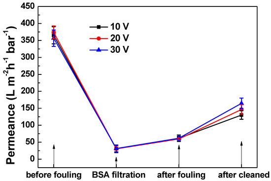Permeance of PANI/EG composite membranes (virgin, BSA fouled, after fouled and cleaned) at different applied potentials. Experimental conditions: applied potential 10–30 V, operating pressure 2 bar, [BSA] = 1.0 g L−1, room temperature.