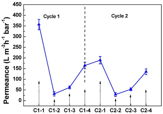 The permeance of virgin, fouled and cleaned PANI/EG composite membranes is shown in Figure 7. There was a significant permeance reduction after BSA fouling—from 357 ± 24 to 32 ± 10 L·m−2·h−1·bar−1. Observations of membranes after fouling showed a gel-like BSA fouling on the surface of the membrane, which was, therefore, the major reason for the permeance reduction. The presence of applied potential promoted the removal of BSA fouling from PANI/EG composite membrane, and the membrane defouling property has a positive relationship with the applied potential. The permeance increased to approximately three times that of the fouled membrane, and the membrane permeance recovery arrived at 46.2% of the virgin membrane under the applied potential of 30 V. This result is comparable to the published work, which showed that applied potential can lead to 43% reduction of the operating pressure [10]. Besides, another cycle has been added to investigate the membrane durability, which stands for long-term operation and stability of membranes. Figure 8 shows the membrane permeance under the applied potential of 30 V at different cycles. It was found that the membranes exhibit good fouling reduction behaviour at two cycles, indicating that PANI/EG composite membrane has the potential for a long period operation.