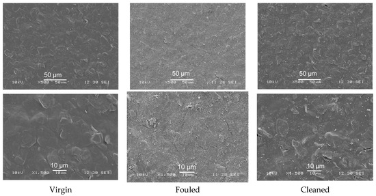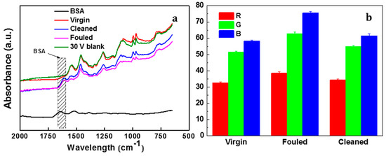 Figure 11a presents the FTIR spectra of virgin, fouled and cleaned PANI/EG composite membranes. There are two regions in the BSA spectra, namely 1700–1600 cm−1 and 1550–1500 cm−1, unique to the protein secondary structure amide I and amide II, respectively. The amide I region is typically used for BSA structure analysis due to signal intensity [47]. Therefore, this region would be used for fouling study. Virgin membrane and a control test of 30 V without fouling displayed a similar spectrum, indicating that the membrane and polymer does not break down at the applied potential of 30 V. The amide I functional group of BSA was observed in the fouled membrane, again confirming that fouling occurred. After applying the external applied potential, the imide I peak still appeared in the cleaned membrane, suggesting that the electrical potential application can remove parts of the BSA foulant, but not all the foulants.