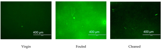 Figure 9 presents the surface morphology of virgin, fouled and cleaned PANI/EG composite membranes (applied potential of 30 V). As can be seen, the membrane was fully covered by foulants after BSA filtration. The application of an electrical potential removed most of the contaminants on the membrane surface. Figure 10 shows the CSLM images of virgin, fouled and cleaned PANI/EG composite membranes. The membrane exhibited a dark green colour from the incorporation of fluorescein. The presence of BSA foulants on the membrane surface changed the colour into much greener one. After applying potential, most of the membrane surface changed back to dark green colour, suggesting that only few foulants were left on the membrane surface. The obtained CSLM images agree well with SEM images in Figure 9. It can be concluded that that most of the surface foulants on the membranes were removed by the application of electrical potential. This indicates that in pore (irreversible fouling) is the main fouling zone not removed by the applied potential treatment and should be the focus of future work.