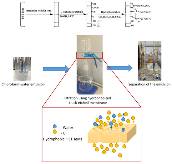In this article, at the first time we present the results of PET TeMs hydrophobization by simple method of soaking in trichloro(octyl)silane solution via polycondensation reaction on membrane surface. Obtained hydrophobic PET TeMs were tested in separation of chloroform–water and cetane–water emulsions.