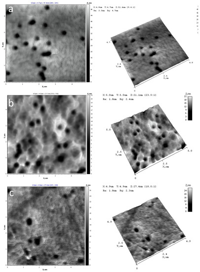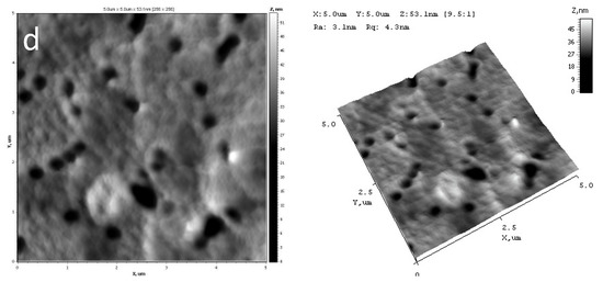 Based on the results of AFM scanning of 5 × 5 μm areas with a resolution of 256 × 256 points, Ra and Rq of the sample surface were determined in the SurfaceExplorer processing program. Average values were calculated over 10 scan areas. The Ra index characterizes the variability in Z of the surface, within the selected area and it is calculated by Equation (2):