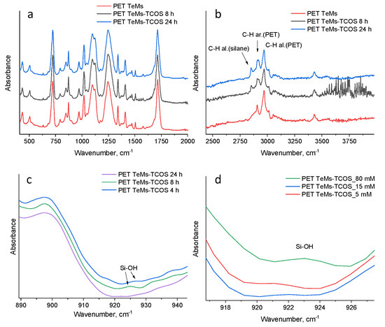 FTIR spectra of the initial and modified PET TeMs depends on time in the range of 400–2000 cm−1 (a), 2400–4000 cm−1 (b) and 890–940 cm−1 (c) depending on concentration (d).
