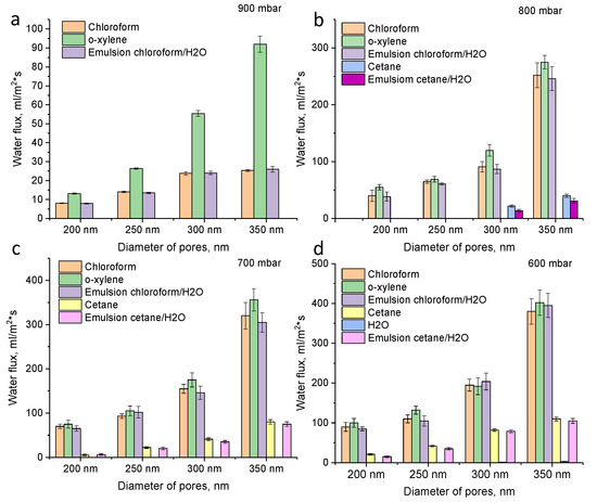 Fluxes for pure liquids (o-xylene, chloroform, cetane, water) as well as oil–water emulsion (chloroform–water and cetane–water) for prepared membranes with different pore sizes (200, 250, 300 and 350 nm) and different pressures (900–600 mbar) are presented in Figure 5. It is seen that with an increase in the pore diameter of the membranes and a decrease in pressure, an increase in fluxes occurs. When the pressure drops from 900 to 800 mbar, there was a sharp increase in fluxes for membranes with a pore diameter of 350 nm from 35 mL/m2·s to 252 mL/m2·s (chloroform). Further, with decreasing pressure, there was a smoother increase in productivity, reaching the maximum value of 380 mL/m2·s at 600 mbar. However, at 600 mbar, it is seen that water can also penetrate through membranes (for membranes with 350 nm, water flux is 2.5 mL/m2·s). Thus, at 600 mbar, the degree of water–oil purification is low. The optimum vacuum pressure is 700–800 mbar.