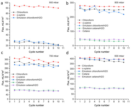 The fluxes of hydrophobic PET TeMs for various solvents and oil/water mixtures after each cycle (pore diameter of 350 nm) at pressure 900 mbar (a), 800 mbar (b), 700 mbar (c) and 600 mbar (d).