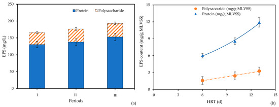 The average of MLSS concentrations during periods I, II, and III were 39.51 ± 2.49, 38.04 ± 1.12, and 36.71 ± 1.17 g/L, respectively. As the OLR in each subsequent period was increased by increasing the feed flow rate, higher concentrations of biomass in the reactor were achieved. In this experiment, a small fraction of biomass was lost as the membrane module was removed from the reactor for chemical cleaning between each period of the experiment. The average EPS concentration was around 166.02, 177.27, and 193.15 mg/L for periods I, II, and III, respectively. Protein made up a large fraction of EPS (77–79%), as shown in Figure 2a. The EPS concentration was not correlated to the biomass concentration, but EPS content increased with the increase in OLR in the reactor. The increase in OLR may have promoted sludge aggregation [26,27]. As shown in Figure 2a, high concentrations of protein were produced rather than polysaccharide. Consistent with this result, a previous study reported that protein had a low first-order kinetics constant (k) compared to polysaccharide. Thus, the increase in SRT can promote greater protein concentration in the biomass, rather than polysaccharide [28]. Biomass-associated product (BAP) formation in the EPS was shown [14,29]. From Table 2 and Figure 2b, the specific EPS was correlated to the average HRT, which agreed well with the results obtained by Santos et al. [29]. The increase in HRT enhanced the degradation of persistent organic substances in high OLR. The ratio of polysaccharine/protein (C/P) ratio was between 0.26–0.28, which was in a similar range to previous studies [21,29]. In addition, the specific protein concentration in EPS increased exponentially, while the polysaccharide increased linearly. A previous study has observed this trend [14]. Increasing feed rate and microorganism concentration caused an increase in C/P. The F/M ratio was higher than 2.5 for high OLR—a finding also confirmed in previous research [30], in which the EPS concentration decreased as F/M decreased. The production of EPS from biological metabolism was conclusively dependent on feed condition, F/M ratio, and HRT.