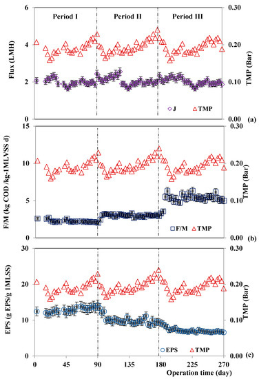 Flux (a), F/M (b), and EPS (c) profiles compared to TMP during operational periods I, II, and III.
