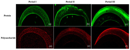 CLSM images of cake layer in AnMBR: period I (a,d), period II (b,e), and period III (c,f).