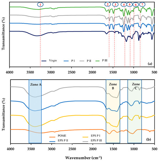 FTIR spectra of (a) virgin and fouled membranes and (b) POME and EPS in each period.
