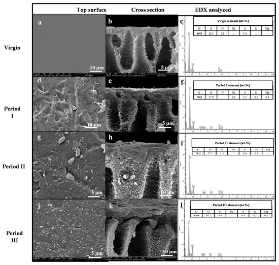 FESEM of the virgin membrane (a): top surface, (b): cross section, (c): EDX element), fouled membrane in period I (d): top surface, (e): cross section, (f): EDX element), fouled membrane in period II (g): top surface, (h): cross section, (i): EDX element), and fouled membrane in period III (j): top surface, (k): cross section, (l): EDX element).