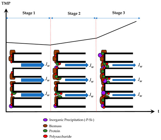 - Stage III: cake and pore blocking. Day 71 onwards, the TMP had risen to 0.25 bar. A dense cake layer accumulated at the surface, and pore blocking occurred simultaneously. In addition, adjacent to the cake layer, the bound EPS released and attached to the membrane.