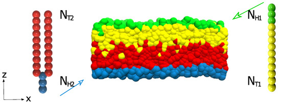 where , and are the bending constant, the equilibrium angle, and the inclination angle, respectively. We use and for three consecutive head particles and three consecutive tail particles in each chain for the first type of lipids with one head and one tail. As for the second type of lipids with one head and two tails, we use and for three consecutive head particles and three consecutive tail particles in each chain; and for the last two consecutive head particles and the first tail particle; and for the last head particle and the first two tail particles. We adopt the above data based on many previous studies [40,46,47]. However, the asymmetric structure of lipid molecules has been studied more before; we select two different types of lipids, which are precisely different from the previous works.