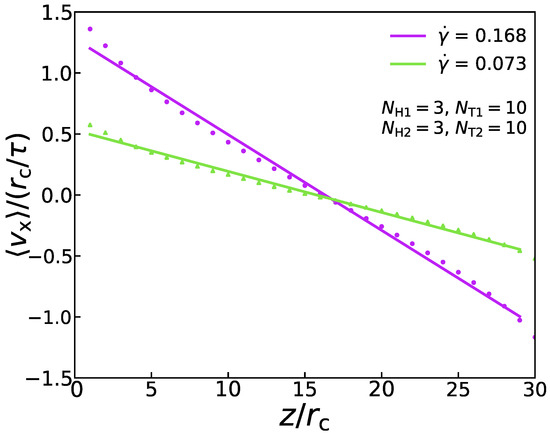 where signifies the shear viscosity. In the DPD simulation, this momentum flux is applied to the system in an unphysical way [49]. To be specific, the periodic analog box with side length is divided into several slabs along the z coordinate. The atoms inside the slabs, at and , are pushed in two opposite x directions, respectively. By finding the atom most moving against the desired slab movement, the atom with the largest and smallest in the x-direction can be found. As a result of two atoms with the same mass and their location remains the same, the potential energy and the system’s total energy are conserved. Hence, the exchange between the two particles is achieved. As an example, Figure 2 shows that the velocity distribution conforms to a specific linear relationship under the two shear rates, which proves the rationality of this method. Because of the momentum exchange’s periodicity, the sum of the equals the total momentum transferred in a simulation. In addition, the momentum exchange rate by momentum swaps is equal to that of momentum flowing in the opposite direction via a physical mechanism (friction) [49]. Therefore, the Equation (8) can also be expressed as: