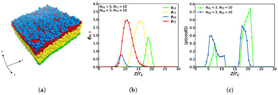 An asymmetric membrane, with , , , and is shown in Figure 3. Assuming that this structure is filled with aqueous solutions, it follows that the hydrophilic head particles (the blue and green beads) are distributed in the outer side of the structure while the hydrophobic tail particles (the red and yellow beads) are distributed in the inner side of the structure, which is displayed in Figure 3a. Obviously, these distributions are due to the attractive interactions between the head particles and water particles, and the repulsive interactions between the tail particles and the water particles. Figure 3b demonstrates the particle density profiles of the hydrophilic and hydrophobic particles along the z-direction (see 3. The method of density calculation in Supplementary Material File for more details). There are four peaks in the density distribution, and the curves of the different colors correspond to the four types of particles in Figure 3a. The blue curve peak of the head particle representing the second type of lipid molecules and the green curve peak of the head particle representing the first type of lipid molecules appear first and last, which indicates that the hydrophilic particles of the head are located in the uppermost and lowest layers of the structure, respectively. The peaks of these two tail particles(the red and yellow curves) appear one after another and overlap partially, demonstrating that the tail chains are interdigitated partially for these two types of lipids. This density distribution diagram exhibits the structure of the asymmetric membrane, which has been confirmed in the previously reported lipid membrane structures [56,57].