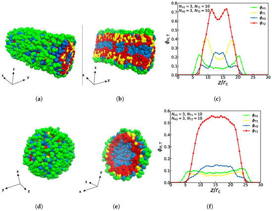 The density profiles of the other two asymmetric structures (asymmetric tube and asymmetric vesicle) are also observed and studied, as shown in Figure 4, where both the complete schematic diagrams and the sectional drawings are displayed. With parameters of , , and , we can observe that the columnar structure has the characteristics of asymmetry, the particles of the first type of lipids are mostly distributed in the outer layer while particles of the second type of lipids are mostly distributed in the inner layer, as shown in Figure 4a,b. This distribution is mainly caused by the amphipathicity of lipid chains in the aqueous solutions. Notably, four different colors of curves in Figure 4c represent four different types of particles, and the yellow and green particles representing the first type of lipids both reach a low value in the interior of the structure, namely, the interior of the columnar structure contains very few of the first type of lipids, which is consistent with former works [29]. Similarly, with parameters of , , , and , the spherical structure also has the characteristics of asymmetry, which is shown in Figure 4d,e. Particles of the first type are mostly distributed in the outer layer, while particles of the second type are mostly distributed in the inner layer. Obviously, four different colors of curves in Figure 4f represent four different types of particles, and the red and blue particles representing the second type of lipids both reach a high value in the middle, especially the number of hydrophobic red particles was significantly higher than the number of particles of any other color, which means that the spherical structure is consistent with the characteristics of hydrophilic head particles and hydrophobic tail particles of lipids. Certainly, the amphiphilic chains lead to the distribution sequence of the tail and head parts in the aqueous solution. The previous works also reported the self-assembly structures of asymmetric vesicle [29,33]. Here, we observed the asymmetric vesicle constructed by two different types of lipid molecules in the aqueous solutions due to the amphiphilic interactions.