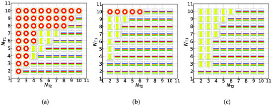 Now, we turn to the effect of chain length on the formation of the asymmetric membrane. We construct the phase diagrams with and for three candidate structures, the asymmetric membrane, tube, and vesicle, based on the tail chain length for the two types of lipids, i.e., and . Figure 5 exhibits the phase diagrams constructed following the minimum free-energy selection: the structural distributions of three asymmetric structures in the conditions of the zero shear flow, weak shear flow, and strong shear flow. Under the zero shear flow, as shown in Figure 5a, there is a clear diagonal distinction between these three structures. Asymmetric membranes are all distributed below the diagonal line, while the asymmetric tubes and vesicles are all distributed above the diagonal line. In other words, with the increase in tail particles of the second type of lipids, asymmetric membranes are more easily formed under the zero shear flow. Conversely, asymmetric vesicles are more simply formed with the decrease in tail particles of the second type of lipids. When the number of tail particles of the two lipids is close to each other, asymmetric tubes are more stable, which embodies that asymmetric tubes are distributed in the middle of this phase diagram. Under the same parameter conditions, we apply a weak shear flow with to these three structures, which is shown in Figure 5b. Contrasting that with the phase diagram at the zero shear flow, it can be observed that, except for the partial asymmetric vesicles of , other asymmetric vesicles are shear-induced into columnar structures when the number of particles in a tail of the second type of lipids is small, and shear-induced into asymmetric membranes when the number of particles in a tail of the second type of lipids is large. This is because the first type of lipid molecules’ tail particle number, also known as the number of outer particles of the spherical structure, is not enough, and asymmetric vesicles themselves are relatively less stable, which leads to their deformations under the weak shear flow. However, under the strong shear flow, we can observe that there are only two kinds of structures, the asymmetric membranes, and the asymmetric tubes, in the phase diagram, as shown in Figure 5c. Asymmetric vesicles and some asymmetric membranes gradually transform into asymmetric tubes by the strong shear force (). As the number of tail particles of the second type of lipid molecules increases, asymmetric membranes can still maintain their structures under the strong shear flow, which confirms that these structures are always stable. Here, the phase diagrams provide the hybrid effects of tail chain length and shear flow strength on the asymmetric membranes, which differ from the previous simulations where only consider either chain length or shear flow strength [28,29,40].
