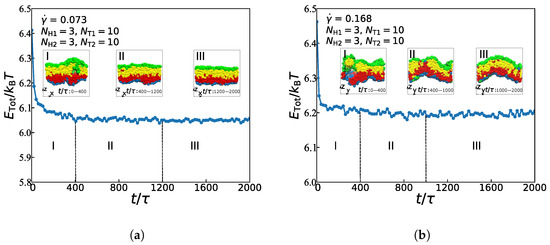 In this subsection, we focus on the dynamic processes to understand the formation mechanism of the asymmetric lipid membranes in the weak and strong shear flows by fixing the chain length with , , , and . Figure 6 illustrates the energy changes with a time step and the main evolutionary states under the weak and strong shear flows, where = 0.073 and 0.168, respectively. In both cases, the process of structural evolution can be divided into three parts: the random generation stage, the mutual adaptation stage, and the formation stage [29]. In the weak flow case with = 0.073, as shown in Figure 6a, the asymmetric membrane is in the random stage between the time t of 0 and . In this random generation stage, free energy presents a trend of rapid decline. Additionally, the structure has changed a lot. Then, when t is from to , the free energy shows a weak decline trend, where the asymmetric membrane is in the mutual adaptation stage. At this stage, the structure is still in a state of continuous adjustment and evolution. In the final formation stage, the asymmetric membrane’s free energy is maintained at a correspondingly stable value, which means that the structure already reaches an equilibrium state. Several previous studies have reported a similar evolutionary process in either the symmetric or asymmetric lipid membranes under the zero shear flow [29,40]. Here, we observed the dynamic process for the asymmetric membranes under the weak shear flows, indicating that the weak shear flows rarely affect the dynamic process for the structural formation.