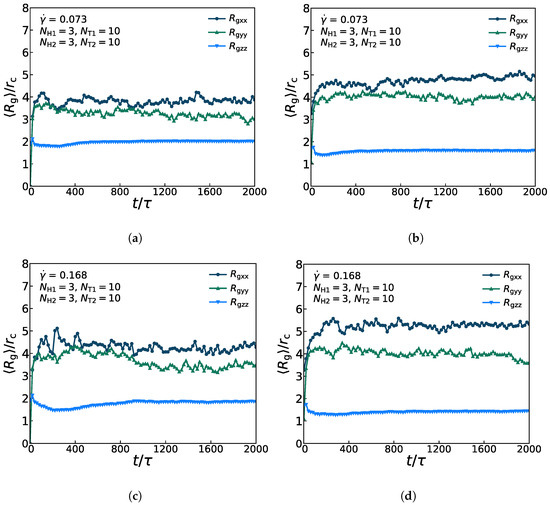 The average radius of gyration of the asymmetric membrane. There are three components , , of at two different shear rates = 0.073 and = 0.168 as functions of time steps for (a,c) the first type of lipid chains, and (b,d) the second type of lipid chains.
